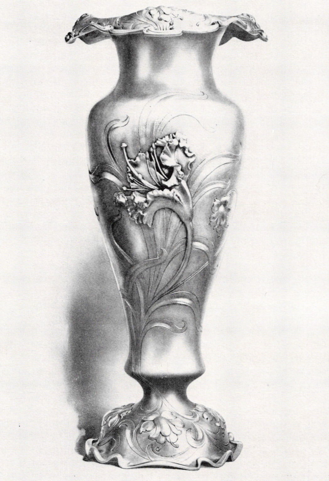 We can assume that Codman's early English training familiarized him with the Arts and Crafts philosophy of integral design and the value of handwork. He had brought with him from his homeland seeds that were slowly to mature into a line of art pieces called Martelé, meaning "hand-hammered" in French. The look of these designs is Art Nouveau, inspired by sinewy natural motifs and turning frequently to exotic materials and unexpected proportions. The deeper value of The Martelé line lies in its philosophy. Under Codman's direction the company gave up its assembly-line methods for art pieces, allowing a single workman to make each piece from start to finish. Although it had been the tradition for designers to specify every detail of a piece, the Martelé line originated with rough drawings interpreted by the worker through forming or chasing processes This digression from traditional methods was a tremendous gamble and apparently one that paid off. Though these art pieces were not big moneymakers for the company, they earned Gorham prestige in both the United States and Europe.