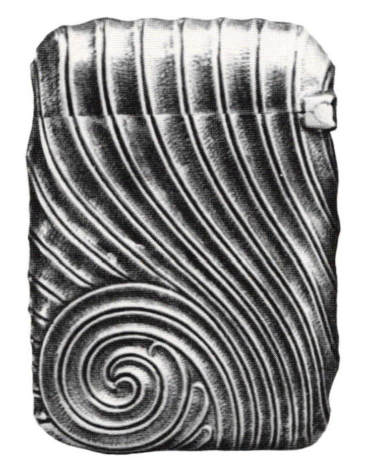 The several cases of spoons and small containers held a more vital attraction. The spoons included some very early pieces, whose traditional fiddle handles owe their charm to miserly thinness and evident use. Also on display were more elaborate pierced serving pieces and ladles, some with handles straying so far from convention as to be almost kitsch, The Victorian eclecticism, for instance, that introduces oriental motifs to gothic patterns has a naive daring. The cigarette cases and matchsafes were less flamboyant, but because of their size they presented an easy reference to contemporary work.