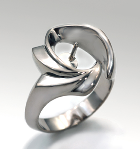 This ring is manufactured using Hoover and Strong's 14-karat white gold alloyed with palladium. It was cast using standard casting methods and materials for gold and silver. The pearl post were fabricated and soldered after casting and pre-finishing. The cultured pearl measures 10.5mm and is too large to mount prior to the fusion welding. Fusion welding of the beads would not cause damage to a cultured pearl or weaken the bond between the glue and the pearl.