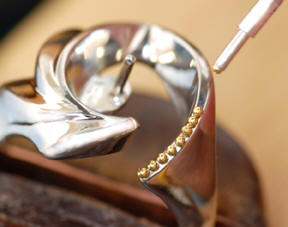 | There must be firm pressure between the bead and the ring. The ring clamp is being held so the vacuum lead can firmly be positioned over the rim of the ring design. A single pulse of energy from the Tack II (generated by depressing the foot pedal) completes the fusion welding of the bead. | |