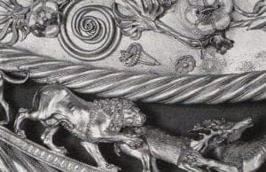 In each of the three interstices between the box-mounted torques, a frieze was placed. Friezes A and C carry figurative scenes, while B displays an exuberant growth of tendrils and foliage, in whose center five doves are perched in the thicket. Frieze B refrains from telling a story and thus remains neutral to serve as a mediator between the upper and lower ones, between the depiction of growth and that of destruction. In frieze A the peaceful togetherness of suckling mother animals with four human figures among them is the dominant theme. By contrast, fierce fighting prevails in frieze C, as animals of all sizes and mythic griffins battle each other, the stronger ones wreaking relentless havoc and death upon the weaker ones.