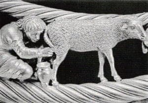 All of the nearly 50 cast figures are remarkable for their exquisite execution: miniature sculptures of such nuance and detail are very rare in the history of goldsmithing. In the central scene (Figure 2), for example, the keen observation of the two chieftains' faces and bodies makes them individual portraits. The face on the left is rounder than the one on the right; the wavy hair of the first contrasts with the cork-screw locks of the second. Even the varying facial bone structures have been depicted, such as the arches of the brows, cheekbones and noses. The left prince, in addition, wears a head band, a highly unusual insignia among Scythians and certainly a status symbol. Similar detailed observations hold true also for the two young milkers.