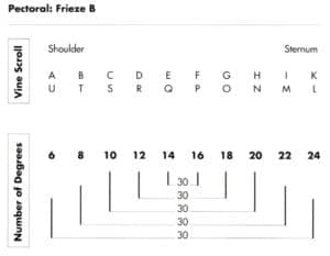 To compose the pectoral, the Certomlyk Master had to overcome the quandary of the inexorably diminishing size of the figures from the center to the narrow corners, made even more difficult by the necessity to space them convincingly on a circle. To solve this problem satisfactorily, he had to have carefully planned the design of the pectoral with an apparent focus on frieze B. This is evident by the fact that the floral scrolls are placed in intervals relating to the center of a circle, placed on the middle axis of the pectoral. On axes radiating from the circle's center the cores of the vine scrolls in frieze B are placed at precise interstices determined by a series of angles that diminish regularly from the center towards the sides. The following diagram gives the sequence for one-half of the symmetrical pectoral. The vine tendrils are labelled A through K for the right body side and I, through U for the left. In the diagram they are placed together according to their size.
