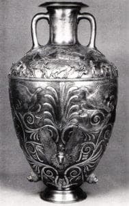 - Amphora from the Certomlyk kurgan, gilded silver (Scythian Art, figures 265-268): men and horses represented in one sculptured frieze, body with floral with birds, animal and griffin fights on shoulder, three plastic spouts on lower body. (Certomlyk Master and studio)