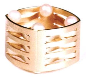 The same process used by the Degree Zero Team, made up of the architects and designers Philipp Mohr, of Pforzheim; Elena Fernandez, of Madrid; and David Serero, of Paris, to conceive and create architectural models may be used at one and the same time for furnishings and for jewelry. The most far-reaching project that has been initiated lo date is Metaring. A jewelry collection that was designed by a computer and produced with machines in the Rapid Proto Type process. The special thing about it: the consumer is not subject to the dictates of the designer, but can manipulate the jewelry by inputting data according to his or her own wishes. This leads to an infinite series of various objects, each of them selected and produced according to taste. But that is the final goal. At this time, selected pieces from the wide variety of imaginable models may be produced in any size desired and in unusual materials such as magnesium and palladium. By means of the Internet, the process is meant to be available to any participant in any place in the world. Produced at a small factory that is closest to each client. Meta Ring jewelry pieces are currently produced for the American market in New York and for Europe in Dresden and Pforzheim. Information: www.metaring.com • kph