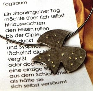 For some years now, the jewelry designer Petra Georg-Achenbach has been designing her jewelry pieces after poems by the Walldorf-based lyric poet Renate Odenkirchen- Büchner. The creations are entitled "Thoughts of Fall," "A Home for Two," and "Late Summer." Various materials and forms are a ways brought together. During her travels in France and Switzerland, Petra Georg-Achenbach collects various stones from natural settings, and then uses them to create jewelry pieces at her studio near Siegen, in Westphalia. The lyric poet Renate Odenkirchen-Büchner also takes up the theme of experiencing nature, both that of feelings and passions, and that of the human species. It is the desire of both artists that people enter into a dialogue with their work and learn more about themselves through the process. Kph