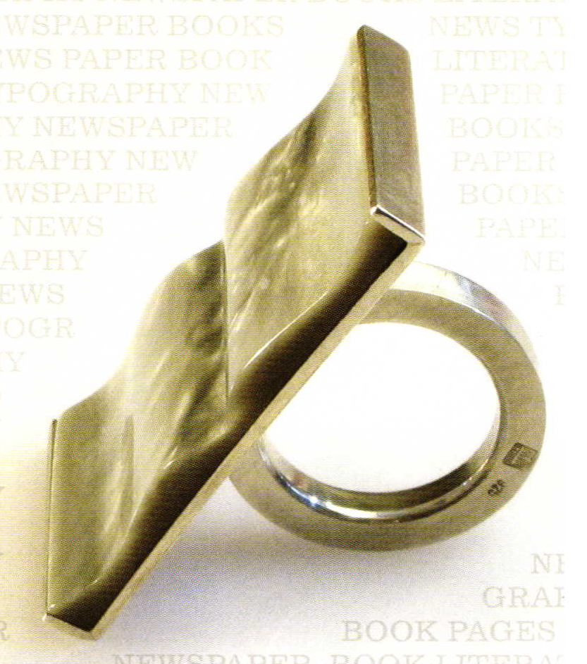 Strictly limited is the number of these unique pieces of jewelry created by goldsmith Suzanne Thiel from Heidelberg/Germany. Only 50 rings "Book Pages" made from Galalith, an early plastic, are going to be created. Once the existing material is used no more rings like this can be manufactured. The artist used the original samples in the genuine colors of an 1938/39 sample collection and set them in fine sterling silver. Formed like an open book the rings capture the spirit of a decade and are on their way to become "modern classics".