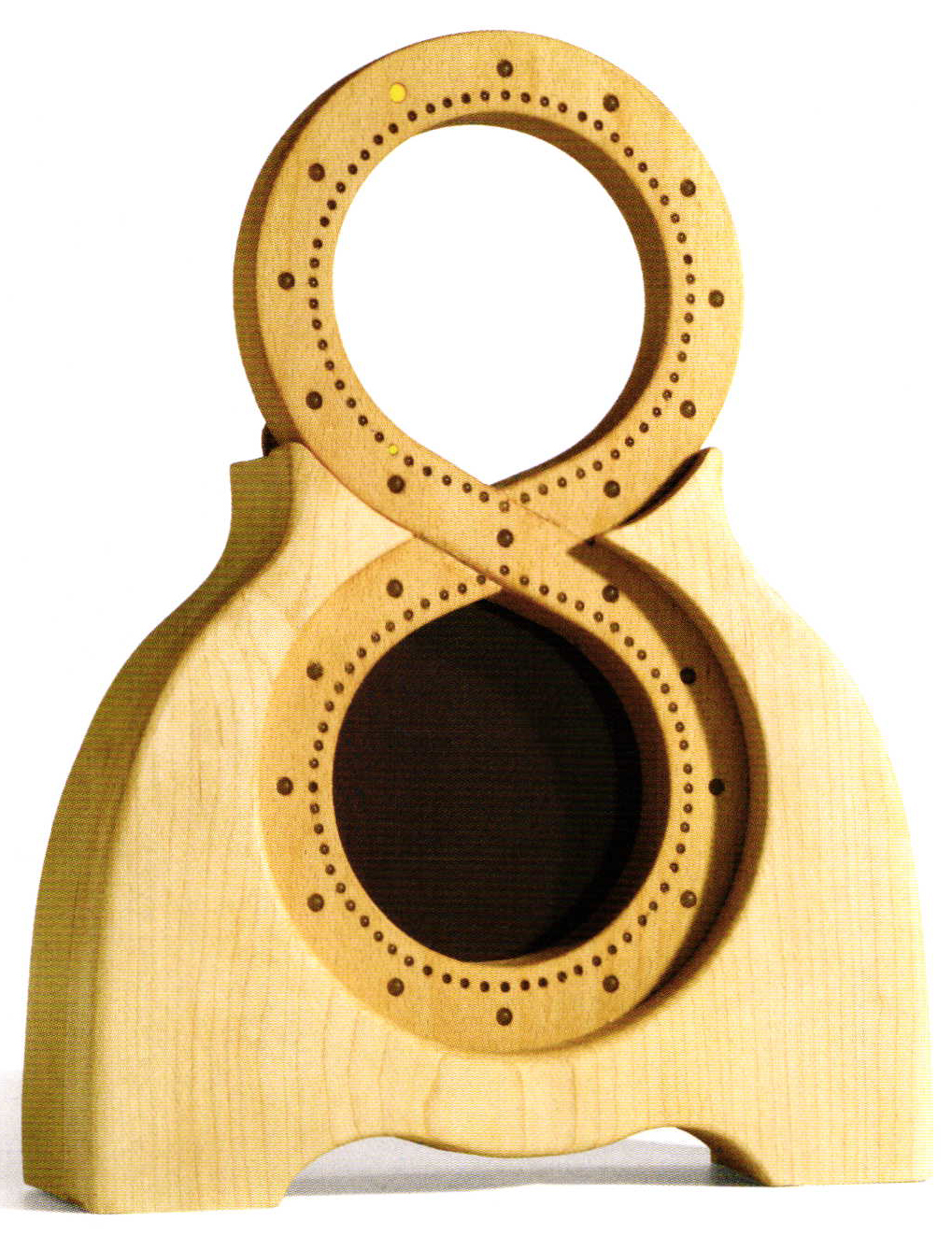 A row of light-emitting diodes (LEDs) are used to display the time. The large LEDs indicate the hours, while the smal ones stand for the minutes. The uppermost point shows 12 p.m., while the crossing point on the lemniscate is 6 p.m. or 6 a.m. Midnight is right at the bottom. Accordingly, minutes are read on the inner ring of the lemniscate. In a sense, this provides an expression of the constant passage of time. The difference between day and night accentuates the fact that the upper loop of the lemniscate is open, while the lower loop, nighttimes, has a dark surface as a background. This also incorporates a solar cell, which provides the energy for the clock. The lemniscate clock is 33 cm high, 25.5 cm broad and 7 cm deep. The front is made of maple wood, while the body is made of beech. All wooden parts are treated with eco-friendly linseed oil. The clock is radio-controlled. www.deiningdesign.nl/ * ahe