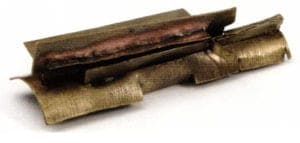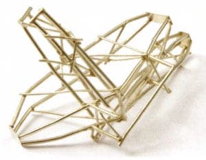 Taking a stroll through the abandoned lignite mine near Lauchhammer in the Lusatia region of Germany, the student Karoline Peisker (whose name was Finke earlier) was inspired to make a special line of jewelry: six miniatures (brooches) made of sheet brass and gold wire tell the tale of an abandoned mine. Ms. Peisker, a student at the Burg Giebichenstein Art School, explains her ideas. "I created 'the Excavator' inspired by the photograph of a landscape with a conveyor belt. I wanted to design a frame that lets you see the traces time had left on its crooked construction. Thin golden sheets mark the borders and put the rhythm and direction of the gold wires into a specific order. The Excavator was crafted of pure gold to symbolize the treasures that it once conveyed out of the depths of the earth. A construction mounted of gold wire is added to the 'House' crafted of sheet brass." Karoline Peisker describes another motif. "With my 'Industrial Landscape,' I tried to illustrate the unity of industry and landscape. I structured the landscape with a broken-line engraving and cut it tightly around the building." karolinepeisker@web.de * ahe