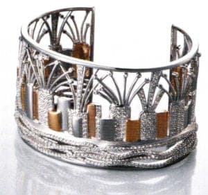 The extraordinary creations were honored based on how much they met the challenge set, originality, wearing comfort and technical execution including the subjective judgment of the members of the independent jury and the festive award ceremony took place at the Baselworld show. First prize went to Aurélie Ledesma for her Pearl and Digital Culture creation, a necklace that links a magnificent South Seas cultured pearl (as the symbol of dreaming) and a USB key (as the symbol of digital culture) via gold, silver and silicon. This balanced combination of colors and the crystal-clear design are amplified by the contrast of the polished yellow gold areas with the filigree structure in silver that are quoted again on the hand-crafted clasp. If you remove the USB key for its technical function, you can tilt the top of the pendant by 180 degrees, which brings a small brilliant to light. The pendant closes around the second silicon cord and the pearl visually moves into the foreground.