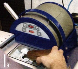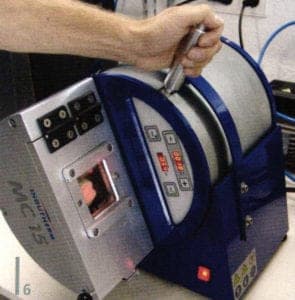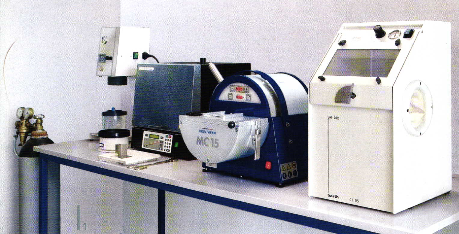 An entire foundry covering just a few square feet (on the table on the left): Vacuum mixer for bubble-free mixing of the investment slurry. The vibrator plate eliminates air pockets. The 950°C furnace for melting out the wax and firing the form. Mini casting system MC 15: sand blaster cabin for a perfect surface finish