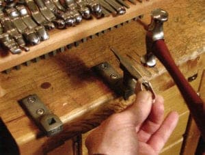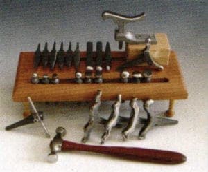 The speed at which a setting can be made is dependent on the suitable tools that are used. Punches and mandrels do a good job, but the small stake developed by William Fretz permits rapid and precise work. The tool can be used in a versatile manner for oval settings, settings in imaginative forms and for small receptacles. It can be used to form rectangular settings with sharp edges that only need to be soldered on one corner. It can also forge anticlastic forms. The wave shaped stakes required for this have to date only been available in a much larger size. The more practice a goldsmith has, the greater the number of forms he can create. In order to be able to level absolutely any form perfectly, the shape of the stake can be modified by forming it with old files and then polishing it to high gloss with sandpaper and a polishing wheel. In this, it is important to take note that every scratch remaining will be transferred into the precious metal. The stakes can be easily exchanged and placed in the supplied holder attached on the work bench William Fretz offers the stakes individually and in eight different sets, tailor made to suit the required stages of work. www.fretzgoldsmiths.com * cp