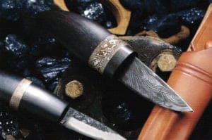 Knife made of damascene steel with Mokume Gane rings on the grip. Klaus Loose