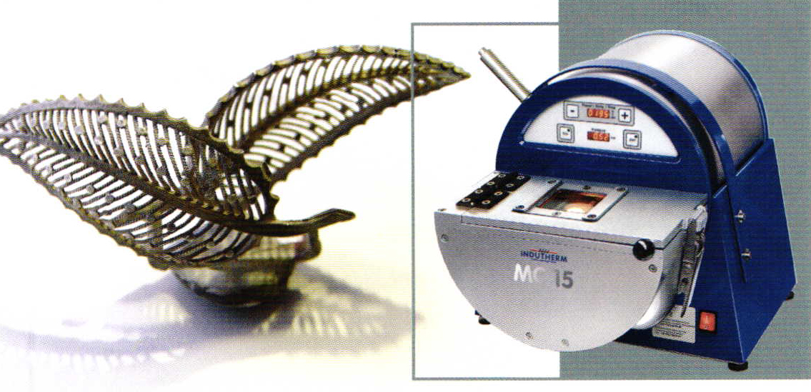 The new mini casting system MC 15 by Indutherm was successfully launched on the German market in the fall of 2006. The device will be presented to a specialist audience at this year's international trade shows. According to the Indutherm Managing Director Peter Hofmann, users of this new machine concept to date can be found among both self-employed designers and goldsmiths, as well as in industrial production. MC 15 is the ideal solution, whenever it is a question of producing small quantities or unusual alloys that should be cast with the lowest possible material losses, but also if cast elements are needed as quickly as possible. The small casting bulb means that on the one hand, the firing times are very short, and it also means that very little material is required for the dead head. This is certainly a reason for the fact that the small system is used frequently and specifically for casting platinum. In the 2007 version, the maximum bulb dimensions were enlarged to 80mm in height / 80 mm Ø, thus meaning that the capacity is also fully sufficient for larger items of jewelry, for examplebracelets. www.indutherm.de * ahe