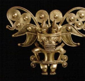 For the indigenous cultures, gold initially gained significance when it was transformed into religious symbols. Wearing gold jewelry was reserved for the political and spiritual elite. The image of the bird, which appears in almost all cultures of historic Colombia, is symbolic of the transformed shamans who 'fly' into other worlds in the cosmos in their trance state and communicate here with spirits and ancestors or negotiate with the Lord of the animals. Frequent motifs of this pre-Hispanic goldsmithing included various combinations of people, animals and plants. They were based on the idea that anyone can transform himself into another being by wearing a mask or painting the body.