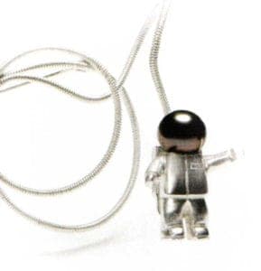 'Le petit cosmonaute' by Heike Andres Zimmermann is a playful interpretation of the theme, depicting a small astronaut as a brooch. The piece won first prize in the category and will be submitted to the international finals in May. The astronaut is in the form of a silver Playmobil figure with a large Tahiti cultured pearl for its head.