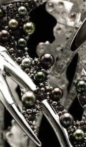 The 'Planétaire' pendant by Stefan Zimmermann is also an innovative idea and a clear winner in this category. The blackened silver pendant is enticing with its diamonds and three Tahiti cultured pearls, taking the observer into the sparkling starry skies.