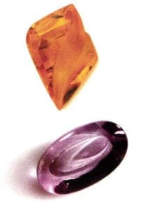 Red and green are the trademark of a less precious, opaque gemstone in the quartz family: dark-green heliotrope has fine red points or stains of ruby glimmer. This is what has given them their name blood jasper. Another complimentary couple comes from Bolivia. They are violet amethysts with yellow parts. People have known for over 250 years that amethysts turn yellow to reddish brown when heated to 500 degrees Celsius and that this is how most of the citrine on the market is produced. However, until recently, no one had known of two-tone deposits of a natural origin. Ametrine was taken from the combination of citrine and amethyst; it is of particular interest to people with esoteric inclination.