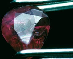 | A ruby marquise prior to heating with a jeweler's torch (left) and after excessive direct heat has been applied. Note the two small white crystals in the center of the stone have "exploded," causing the stone to fracture. | |