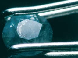 | The ruby (left) and sapphire (right) pictured above both exhibit the results of excessive heat in combination with firecoat, in which the firecoat has formed circular areas of film on each stone's surface. The sapphire also has a metallic residue on the film, the result of scraping with a steel probe. | |