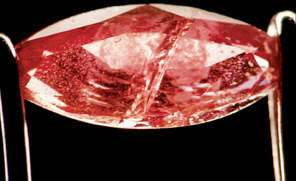 A ruby marquise prior to heating with a jeweler's torch (left) and after excessive direct heat has been applied. Note the two small white crystals in the center of the stone have "exploded," causing the stone to fracture.