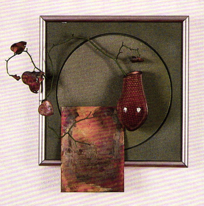 As one who often makes objects for the tea ceremony, Harlan Butt continues in his current work, which was the subject of a solo show at California College of Arts and Crafts, Downtown Oakland Gallery, last spring, with vessels and pictorial wall pieces. These extend his range of Orientally inspired work, searching for a quiet, Zenlike transcendence in the spirit of contemporary metalsmithing.