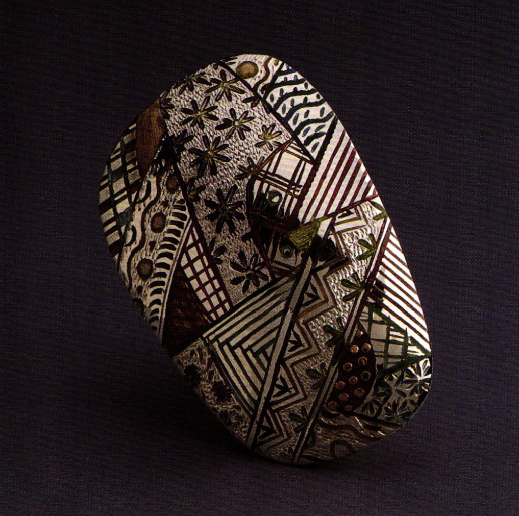 Another piece making similar use of metal and enamel is Untitled Brooch from 1989. Here Hal composed an opulent surface of contrasting patterns. His use of enamel, although meticulous and restricted, lends this piece a fullness of gesture and spontaneity. Its carved surface and geometric patterns suggest connections to Eastern motifs, especially those found in textiles. Although quite intimate in scale, its full rounded form projects a feeling of monumentality. Like some hidden script, its symbols demand closer investigation.