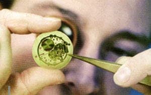 Control is everything: a Normos watch maker checks the movement plate