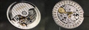 Two sides of the new Nomos automatic movement: a look at the rotor on the left and the view beneath the dial on the right