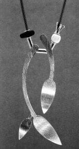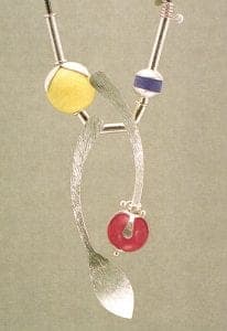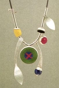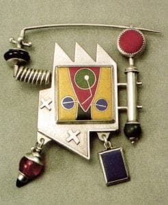 Brummel's striking artistry in sterling and enamel is worn from London to Los Angeles. His pieces range from simple, single-element earrings to elaborately constructed multicomponent pieces. Many of Brummel's standard objects - typically brooches and pendants of cloisonné and semiprecious stones, begin as simple frameworks. Structural forms he has designed are like mannequins yet to be clothed. From these basic starting points Brummel crafts unique pieces. He might add a cloisonné face or create appendages of bezelled lapis, affix dangling cones of onyx, or sand-blat a portion of plain enamel to create a textured design. Some pieces have planes of colored laminate, a small working whirly-gig, or a slinky-like stretch of tightly coiled sterling. A simple pendant, a skeletal fish caught on a leather line, is comprised solely of sterling and caprice.