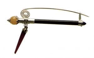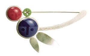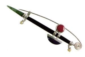 His missile like projectile brooches might feature any combination of bone, jade, enamel, or antique glass, poised and ready to blast off their settings of polished sterling. Brummel often integrates everyday objects into his designs; a pair of earrings resembling small cages house flea market marbles; a similar pendant holds an ordinary rubber stopper, no longer ordinary in its new environment.
