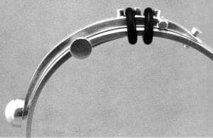 The pieces which have been most satisfying for Brummel are a series he calls Art and Science Handcuffs. These mechanical bracelets are marvels of engineering in hand-sized scale. Simple in comparison to his elaborate pendants, the cuffs are frugally adorned with small bits of bezelled enamel and bands of black latex. They are his proudest achievement and deceptive in their simplicity. The clasp system slides together to encircle the wrist with a solid, ingenious snap. Compared to his early works the sheer design of these cuffs attests that Brummel's maturation, patience, and dogged quest for perfection paid off.