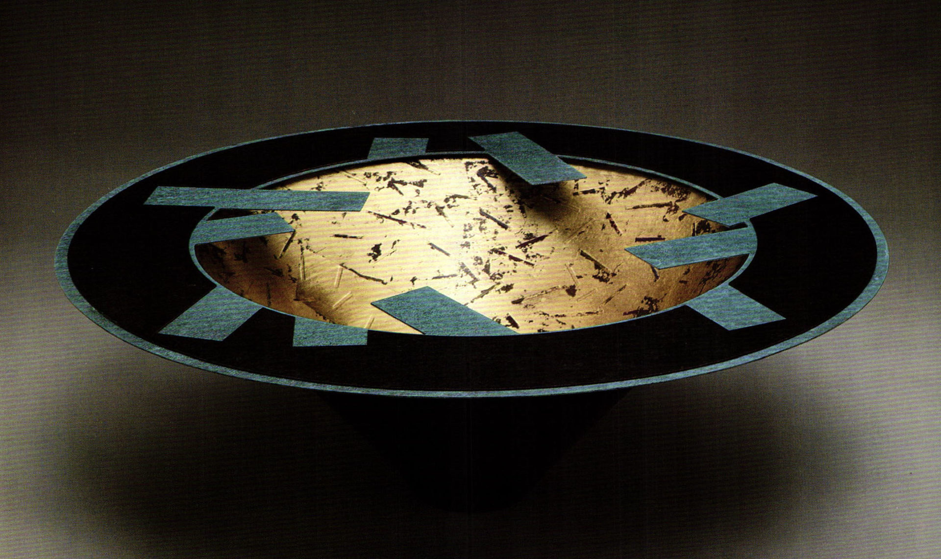 Her most recent, and still continuing, series "On the Edge" retains implied movement, as multiple planes balance precariously on the rims of the spun, symmetrical bases. Shirk's earlier titanium jewelry pieces triggered an anxiety about touching them, in case they weren't all together. The works in the "On the Edge" series create a hold-your-breath reaction, lest you move too close and launch a domino effect of falling, patinated planes. "Sometimes I think of the work I did before 1983 as being done without access to all parts of myself," Helen Shirk explains. "I had only a soft focus image of what I wanted. It was intellectual, but not pertinent to how I felt. It was not grounded in where I was. My environment now nurtures me."