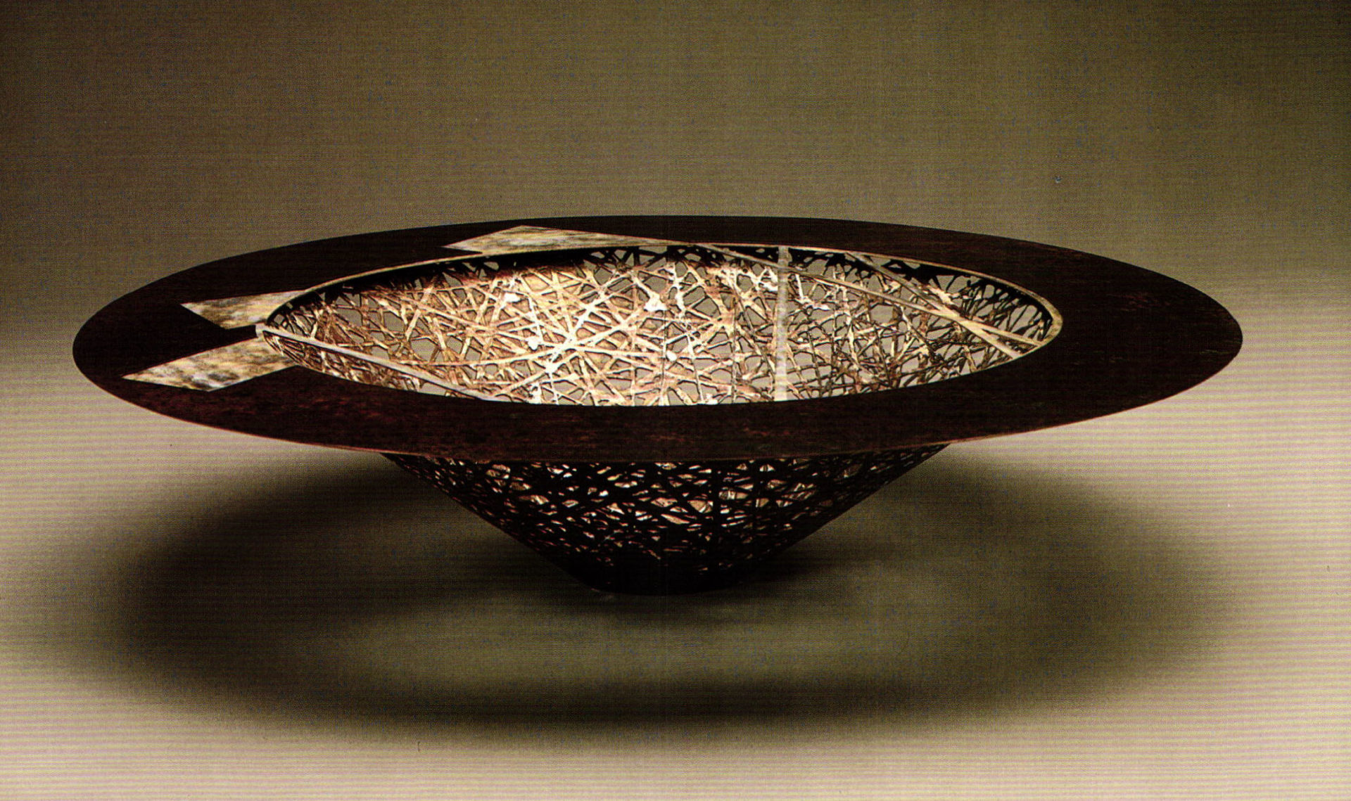 Asymmetry gave way to the circle, a simpler, smoother form. Small bowls were sunk in the center of large, fat rims, with oil pastels or prismacolor adding texture to the eye. Pulsing, spun and etched bowls began to appear. Helen Shirk located a company in San Diego that makes automobile hubcaps and contracted with them to spin her forms. "Fragile Growth" Vessel BV57E (1989) utilized a waffle-edged shape that was allowed to lose control or "rosebud" during the spinning process. Combined with patina and extensive use of etching, the graceful form appears to ripple in the wind. The structure seems deceptively delicate, a quality important to Shirk: "This is all things that appear to be fragile, but have a tenacity and unseen strength. These are not as fragile as they look."