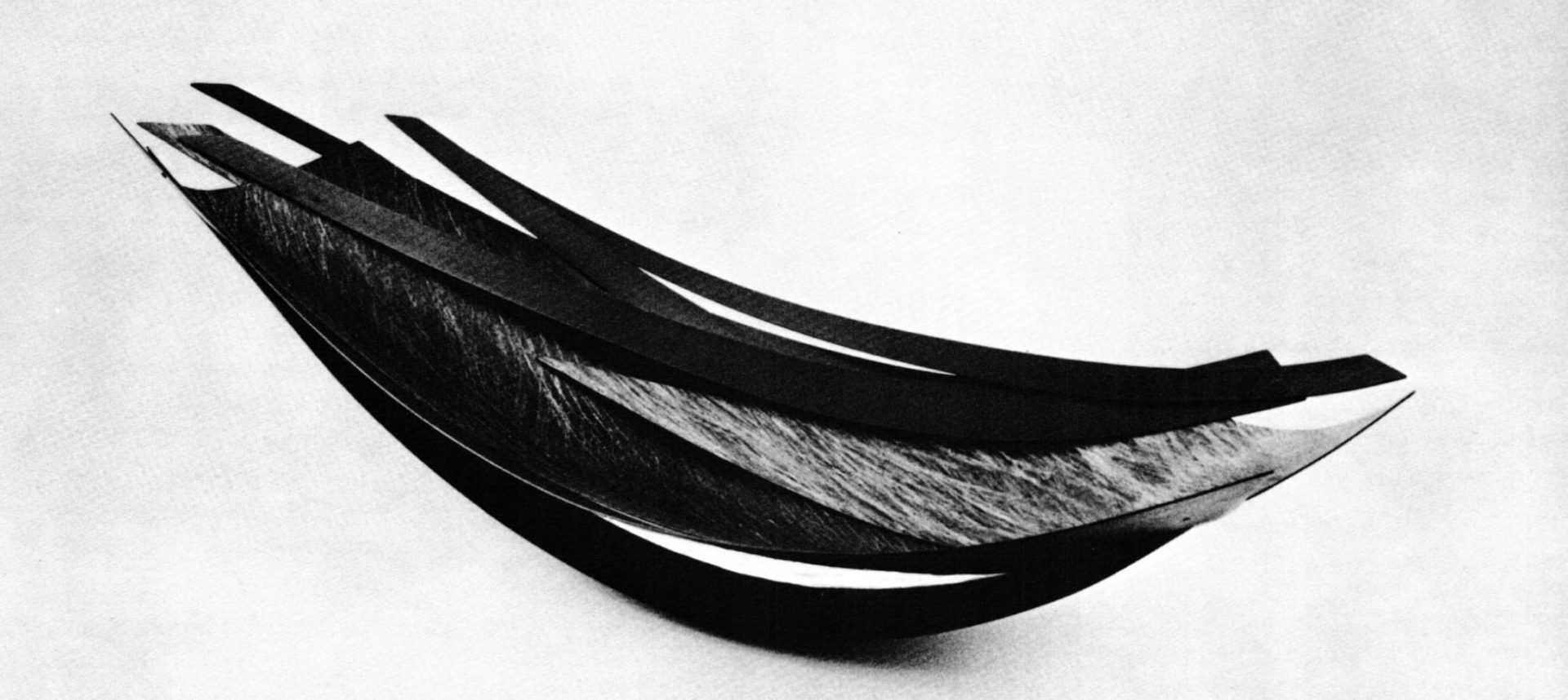 The bird-of-paradise plants in Shirk's yard, sprayed black, then sketched and photographed, also served as a point of departure for this, her most controversial series. Jagged, pointed leaf-shapes sprang forward from the works, creating energy and strength. Softly dappled patinated areas were patterned against sections of mysterious black. The sculptural forms coiled then released, alternately enclosing the layers, then penetrating into space. The central core of the vessels remained concave, as if ready to pull rare moisture from a passing cloud.