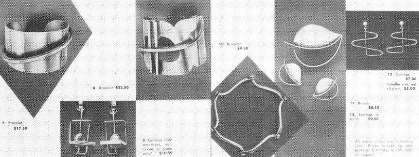 A catalog from the late fifties illustrates dozens of his designs. For example, there is a brooch and earring set mode of sleek boomerang shapes. There are several bracelets that show his talent for combining ordered geometric forms with more improvisational organic shapes. All of his pieces are very sculptural. His sophisticated use of negative and positive space, his preference for the asymmetrical, and his ability to create tantalizing visual surprises demonstrate his highly developed sculptural sensibilities.