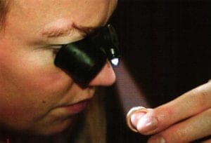 The firm System Eickhorst from Hamburg recently presented a special edition of the silver Dialite lamp with a table joint, which can be switched from daylight to UV light, depending on the needs. The patented assembly of the upwards-facing, long-wave UV light with black glass filter as stone inlay reveals even week fluorescence, e.g. from diamonds and illuminates them with considerable contrast against the dark background of the filter and the shadow blind, which screens off the rooms light.
