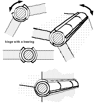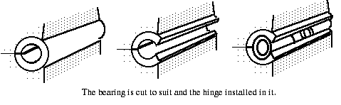 A bearing is essentially tube sections which are attached to the metal being hinged into which the hinge itself is installed. The use of bearings offers us a couple of things. First of all, it offers us a way of increasing the structural strength of our hinge unit. Secondly, it offers us a method of having a stop — that is, unlike a butt hinge, which can rotate over an extreme range, until the two pieces of metal almost touch, you can design a hinge with bearings so that it only rotates a certain amount, and then stops as the bearings collide with each other.