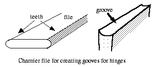 Bearing "how-to": The steps in constructing a simple butt bearing are as follows. We're assuming a rectangular strip of metal, such as you might find on a bracelet hinge, and we will make a cut across it where we wish the hinge to be installed. If there are numerous hinges, then all of these steps are done at the same time, and you just repeat the step over and over again. We have to use metal which is thick enough and strong enough, and I would suggest that one millimeter thickness would be a reasonable minimum for your sheet metal — 1.5 is probably healthier. The ends of the sheet metal are grooved — I'm going to be doing this grooving using a separating disk, and following up with a charnier file, or a round-nosed needle file. Chenier files are rather hard to find these days, and what they are, is a file that has — it is a rectangular cross-section, with the short ends of the rectangle being rounded, and the same width all the way down the length of the file. The long sides of the rectangular cross-section are smooth metal, with no teeth. The narrow edges are half-round files with parallel sides and no taper to them.