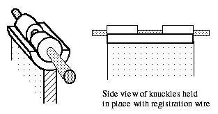 The outer knuckles are soldered into the bearing, using an absolute minimum amount of solder, and, again, placing the solder on the outside. Just as with the basic hinge, it can be a good idea to bevel the bottom surfaces of the outer knuckles to provide a place for the meniscus of solder to go, so that there will not be any interference during the rotation of the hinge, no solder spillage. When Linda Chow solders her outer knuckles into the bearing, she will place a broken drill bit of an appropriate fitted size through the holes in the tubes to help maintain registration. You can use titanium wire for this, graphite pencil lead or iron binding wire as well, as long as it is a pretty good fit to the hole in the tube. It needs to be a good fit to register the tubes properly. My favorite is titanium. You should not have any solder spillage freezing things up, because the registration wire is somewhat distant from the joins that are occurring.