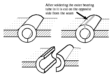 The problems of installing the bearing itself will vary according to the actual piece that you're working on, and here is where, wherever possible, we employ a principle mentioned earlier in discussing construction principles, and this principle is: if you want two pieces to be related, make them out of the same piece. So that when we install the bearing itself, we usually do this using a single piece of tubing, which has a slit in it — one pre-existing slit. This will automatically register both parts of the bearing. If you make the tubing yourself, then you simply don't solder the seam, and then you have a piece of tubing with a slit in it. This is soldered in place on both sides of the parts to be hinged, and after soldering, then the tube is cut apart. The hinge itself is then built into resulting bearing. This means that you need nesting tubing for this construction, the hinge tube should be a perfect sliding fit into the tube used for the bearing.
