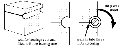 The bearing tube chosen is actually a little bit wider than the box. Once it's all fitted together we solder the bearing tube into the top and bottom of the box simultaneously. If you are worried about freezing the box together, you can place some solder flow retardant, such as White-Out, at the potential seam in between the lid and the bottom of the box. After having finished the solder job, the bearing tube is cut apart, and, as before, we now remove a portion, a section of the outside of the bearing tube, and the amount that we remove determines how far the hinge will open.
