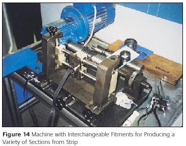 Finally, there is at least one company that makes a single type of machine but with a series of interchangeable attachments. With the supply of matching draw dies and mandrels, it allows the manufacture of a wide range of coiled hollow shaped and twisted tubes and sections, albeit on a fairly small scale, Figure 9. One version of the machine is shown in Figure 14 while a more recent version employs two dies and two feeder strips to make more complex shapes and allow the manufacture of multi-coloured hollow jewellery.