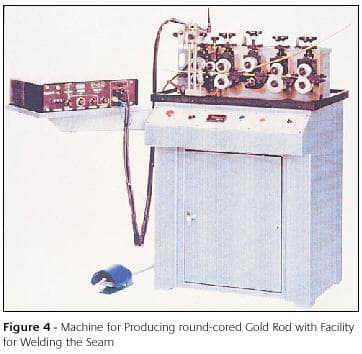 Other techniques include the continuous folding of gold strip around the core followed by automatic resistance welding of the strip edges, sometimes with the incorporation of solder wire into the composite. Equipment for producing this composite is shown in Figure 4. In this approach, seam alignment is no longer an issue but, when making chain out of this composite, the chain machine is fitted with a device to make small openings on the inside surfaces of the links through which acid can attack the core during the core dissolution stage. These techniques, several of which are patented, do require the use of special drawing dies to make the shaped cores, forming dies to fold the gold cladding around the cores and drawing dies to draw the composite down to finished wire size. Much of the technology has evolved in Italy where hollow chain is an established product.