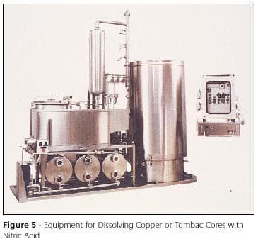 Equipment is readily available to dissolve the base metal core and the better machines address the issues of fume evolution, acid handling and residue disposal. In other words, worker safety and environmental concerns are tackled. For copper and Tombac core removal, nitric acid is used though, for the lower carat golds (14 carat and less), significant attack of the copper and silver in the carat gold can occur. It is possible to avoid this problem by dissolving the core out electrolytically with sulphuric acid but dissolution times increase from the normal few hours up to 24 - 48 hours making this procedure less attractive. Commercially available equipment for nitric acid dissolution is shown in Figure 5, this equipment incorporating ultrasonic agitation to reduce the reaction time.