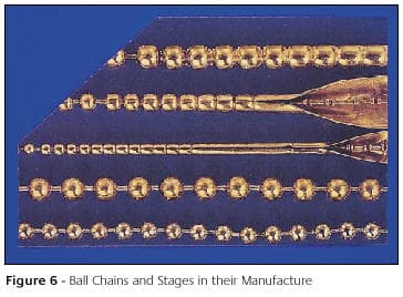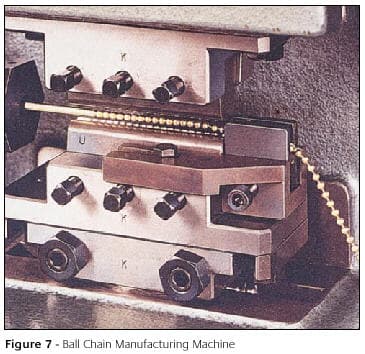Machines are available for forming strip into hollow balls which can then be used in a variety of jewellery components including hand-made chains. Balls from 1.5mm to 10mm diameter can be produced at rates of up to 200 per minute, the balls being formed progressively in a simple press tool. It is also possible to produce ball chains directly on a similar machine but, in this case, the balls are formed around a central flexible core of snap-joined pins. Chain production rates of 40 to 80 metres per hour can be achieved. Figure 6 shows stages in the formation of ball chains and some examples of finished chain while Figure 7 shows the manufacture of a ball chain on a chain machine.