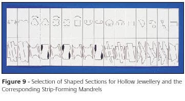 - Alternatively, the strip can be rolled or drawn through special rolls or dies and around corresponding mandrels to produce a specific shape or section, of which there seems to be an increasingly large and varied selection, in coil form suitable for producing bangles and earrings. Figure 9 shows a selection of shapes with the corresponding mandrels offered by one manufacturer.
