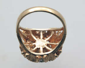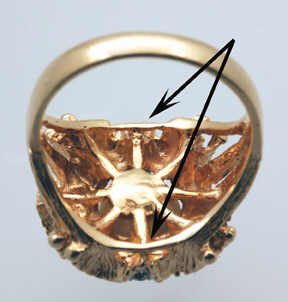 This cultured pearl and diamond ring is in for sizing. When the take-in person inspected the ring, they noticed that the top portion of the ring shank had worn thin. The ring is 14-karat yellow gold.