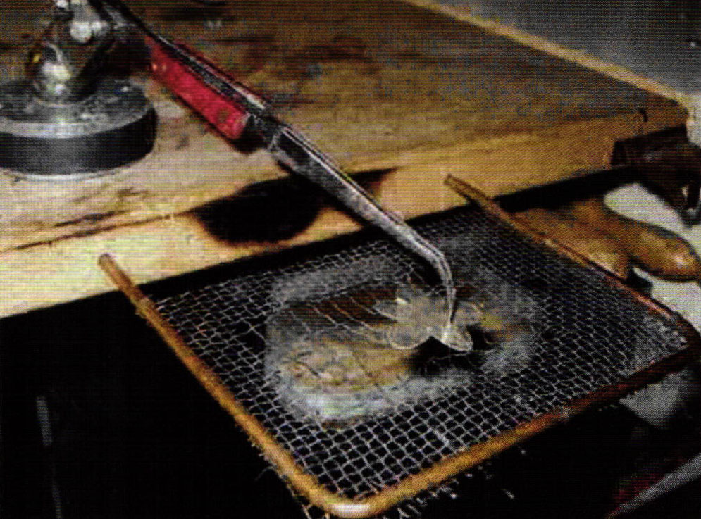 NOTE: Many students had problems with soldering, especially soldering the thin bezel stip, ear posts or the findings posed problems. They had trouble steering the heat of the torch properly so often the strip or the findings burnt away. So we made a little "helper." With this tool you can do all soldering from the back, because the torch's heat goes to the greater and heavier part of the workpiece . The tool is made from a copper wire frame in which a stainless steel net is fastened. In the workbench arc two small holes which holds the frame. This has helped very much.