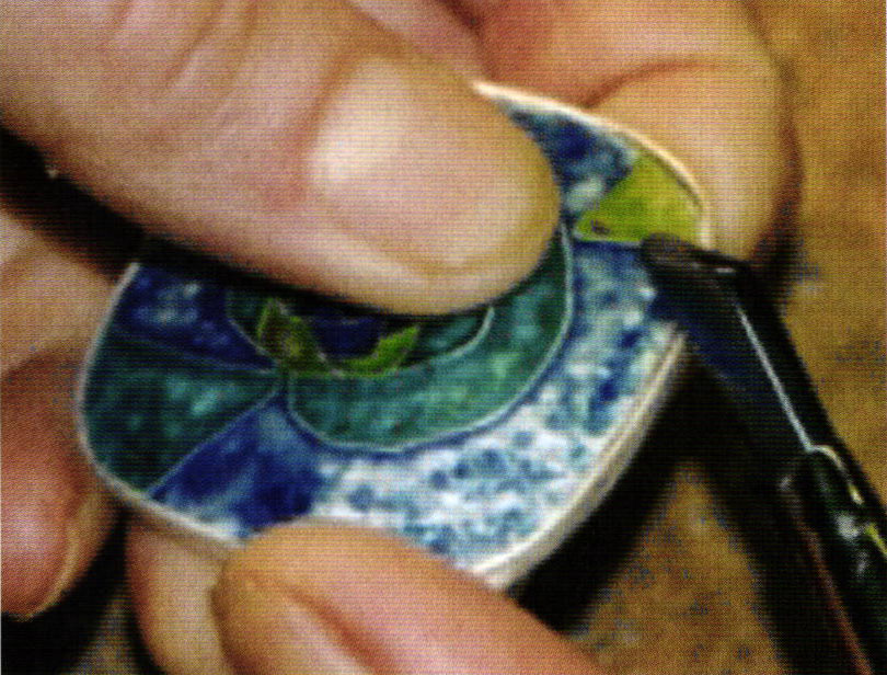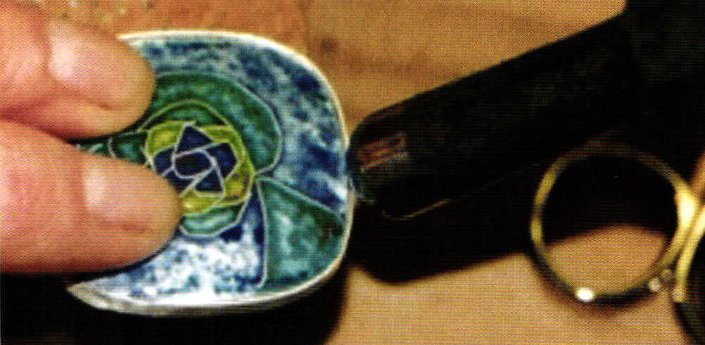 Check whether the enameled piece fits well in the bezel. If not, the edges of the piece must be stoned-off. The bezel should not wedge. Never press the piece by force into the bezel. Remove the enamel piece and saw away the excess around the bezel. After the findings are soldered, the piece is now pickled. Now, grind and polish the completed silver piece and set the enamel tile into the bezel.